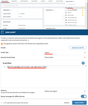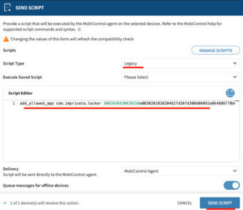 To send the add_allowed_apps script to the MobiControl agent on the selected devices: