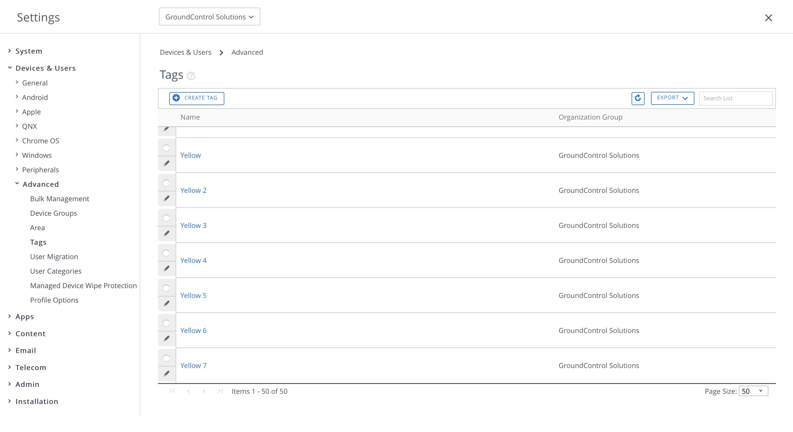 - Click Groups & Settings > All Settings > Devices & Users > Advanced > Tags.