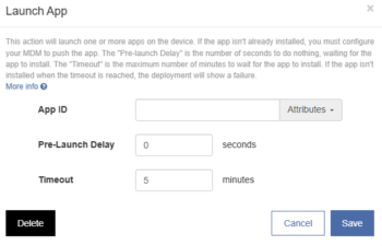At the end of a deployment, Mobile Access Management can launch a specified app that’s installed on a device. This action applies to pre-installed apps, Enterprise Apps and ones downloaded via MDM. If the app is being downloaded from MDM, you can set the criteria for how long to wait for the app to install. If using an Enterprise App, make sure to follow instructions here to ensure it’s installed successfully on the device.