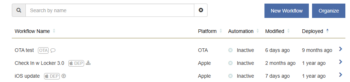 The Workflows list includes current information, including Workflow name, platform, automation, modified and deployed. The Automation column indicates whether any rules are enabled via Automation.