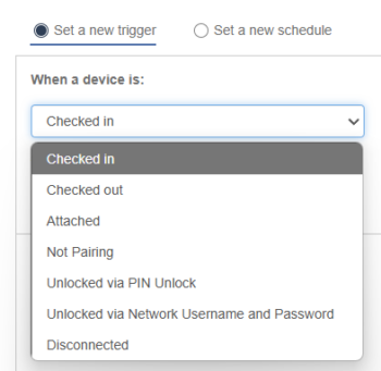 • Trigger: Determines what triggers the rule to run, for example a rule can run when a device is attached, or it can run if a device is disconnected from the Launchpad.