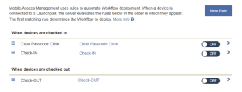 • In general, multiple workflows are not necessary. Keep all the actions in a single workflow, and Mobile Access Management will execute them in the best order for dependable device operation.