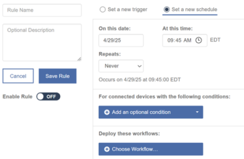 Scheduled Workflows allow you to run Workflows on an ad-hoc basis, or on a daily, weekly and monthly cadence to connected devices.