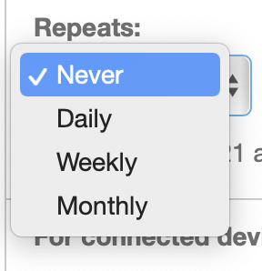 6. From the Repeats list, specify how often the schedule repeats: Never, Daily, Weekly, or Monthly.