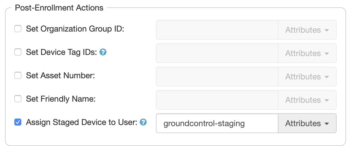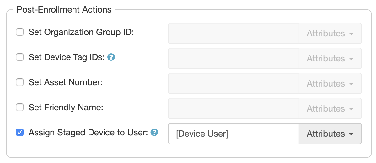 Add the action “Perform MDM Command” to your “Check Out” Workflow. Set this to assign the staged device to user “[Device User]”, the attribute that contains the username of the person checking out the device.