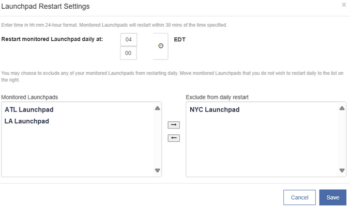 BEST PRACTICE: Set the restart time to 4 AM daily or consider your organization’s shift change schedule and specify a quiet time. - To exclude one or more monitored Launchpads from the daily restart, highlight them in the Monitored Launchpads box, then click the right arrow to move them to the Exclude from daily restart box.