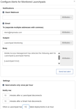 - In the Notify me settings, specify the minutes for Launchpad disconnects and Smart Hub disconnects, and how many failed deployments in an hour.