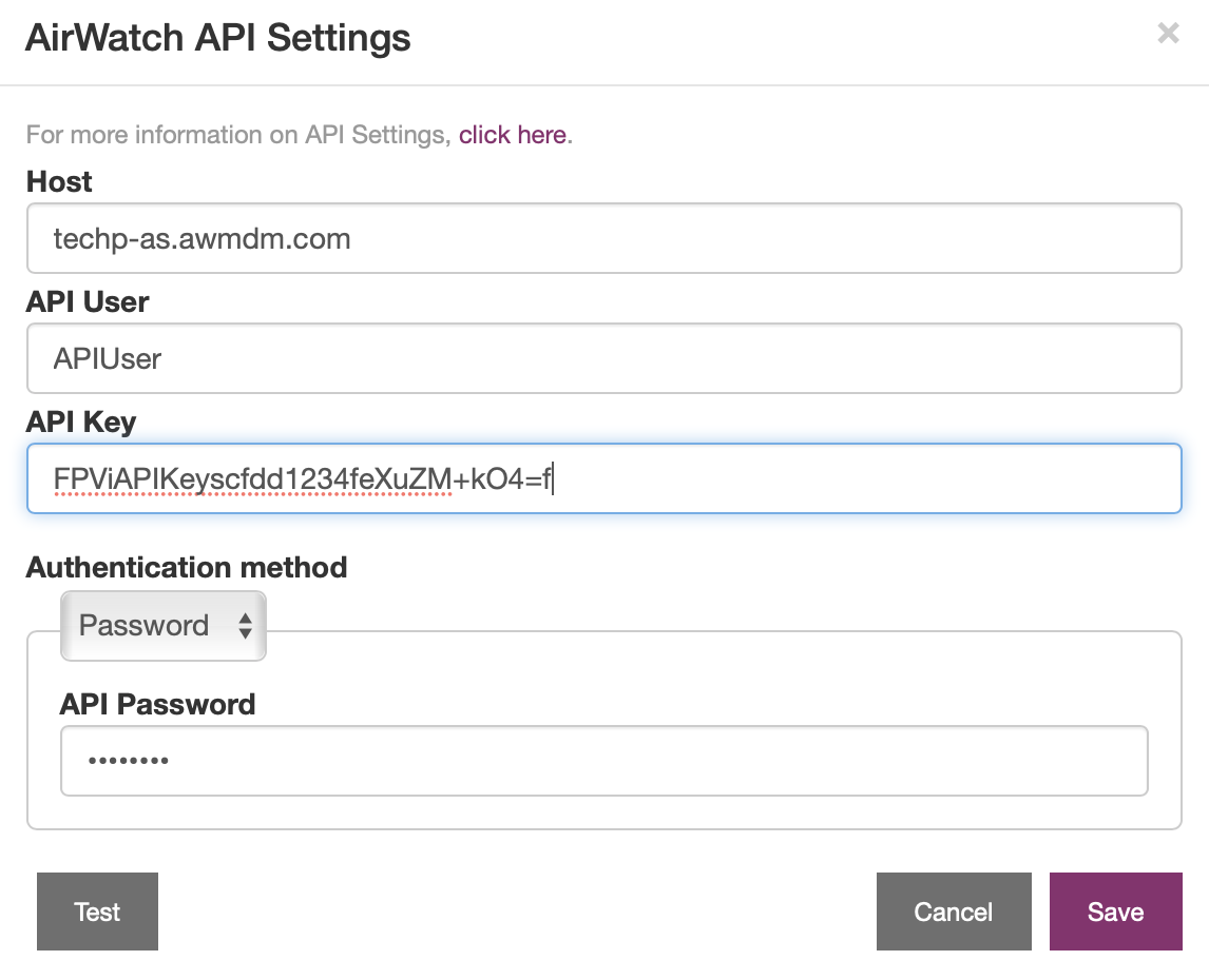 - In the API Settings dialog, add API settings that you obtain from the Workspace ONE admin console.