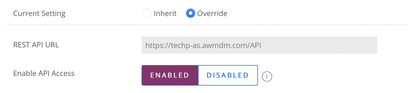 - In your Workspace ONE console, visit Groups & Settings > All Settings > System > Advanced > API > REST API > General.