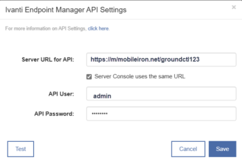 - In the API Settings dialog, configure the API settings for Ivanti Endpoint Manager Mobile: