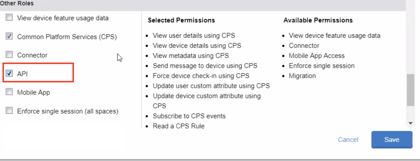 - Scroll down to Other Roles section and select API. Click Save.