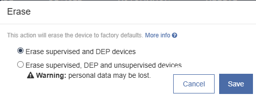 The Erase action includes an option to erase only Supervised & DEP devices or to erase Supervised, DEP and unsupervised devices. This option exists as a safety, to help you avoid erasing devices by mistake. Keep the first option selected for most uses.