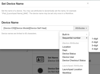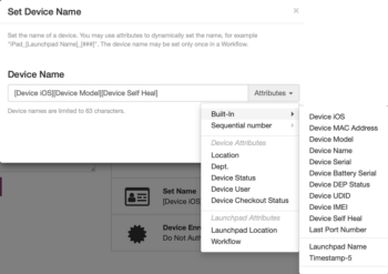 Device and Launchpad attributes are available from the menu, including Built-In attributes, Sequential numbers (up to 4 digits), and custom attributes created by an administrator.