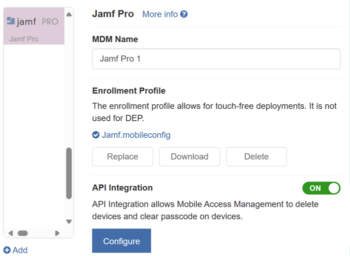 Imprivata Mobile Access Management is integrated with Jamf Pro. The instructions below describe how to set up MAM to use Jamf Pro APIs. Optionally, you may add an Enrollment Profile for touch-free enrollments of non-DEP devices.