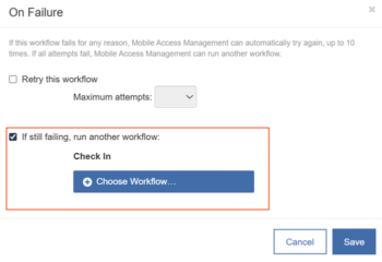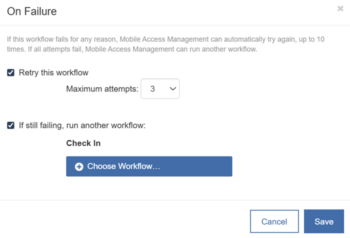 - Select the If still failing, run another workflow option only and select your Check In workflow. This On Failure action returns the device to the checked in state when this final step is not completed after 60 seconds.