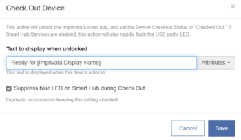 - Imprivata recommends keeping the Suppress blue LED on Smart Hub during Check Out option selected. Instead of displaying the blue LED indicating a “deployment in progress”, the Smart Hub will flash the white LED, indicating that the device is ready to be removed from the dock.