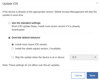 Mobile Access Management’s iOS Update Delay takes advantage of the signing overlap during iOS transitions. For a period of a few days, Apple allows both the old and the new iOS versions to be installed. Mobile Access Management’s feature simply exposes that choice, allowing you to set a preference to use the old or new version.